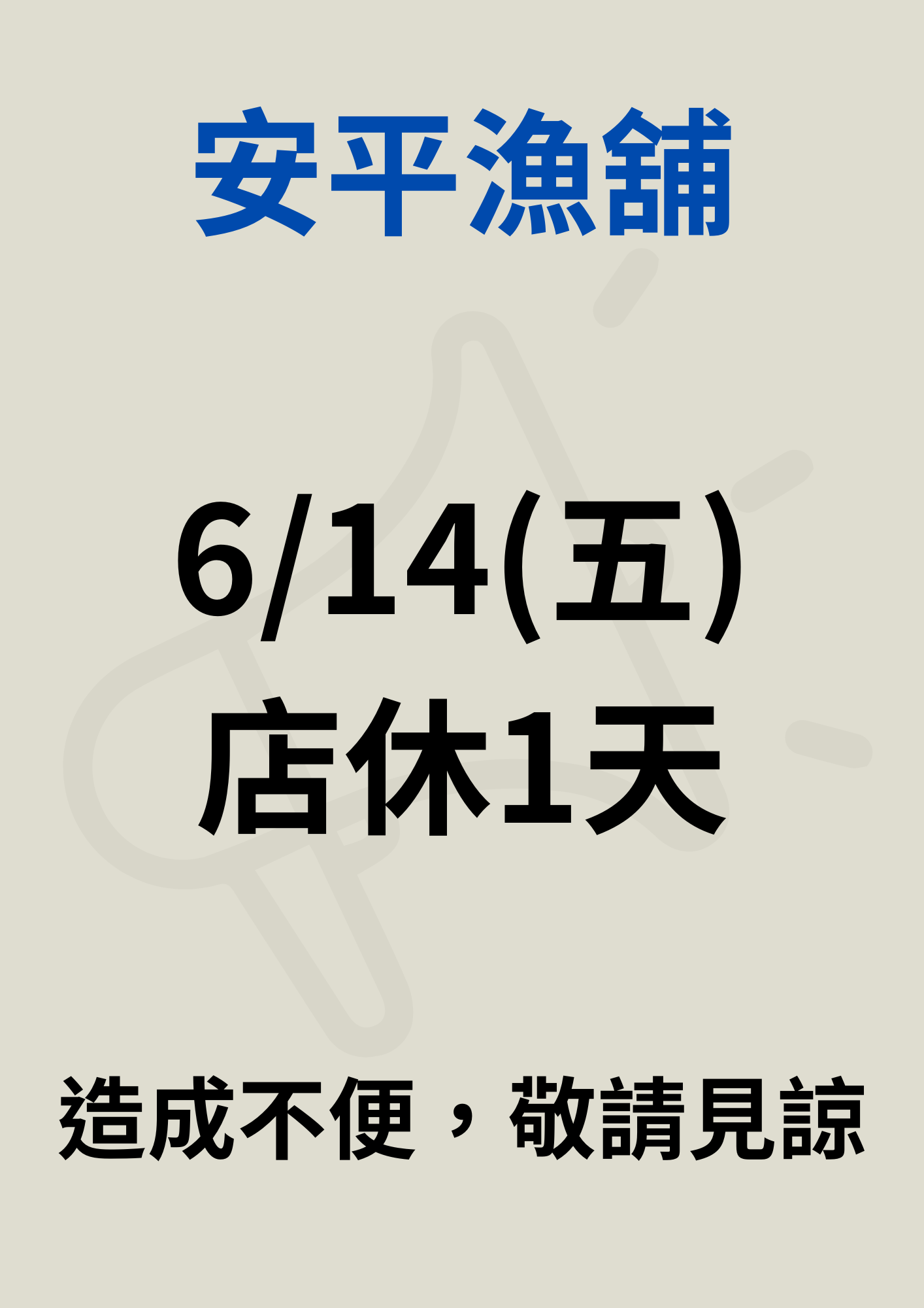 本會安平漁舖於113年6月14日(周五)店休一天,造成不便敬請見諒!
