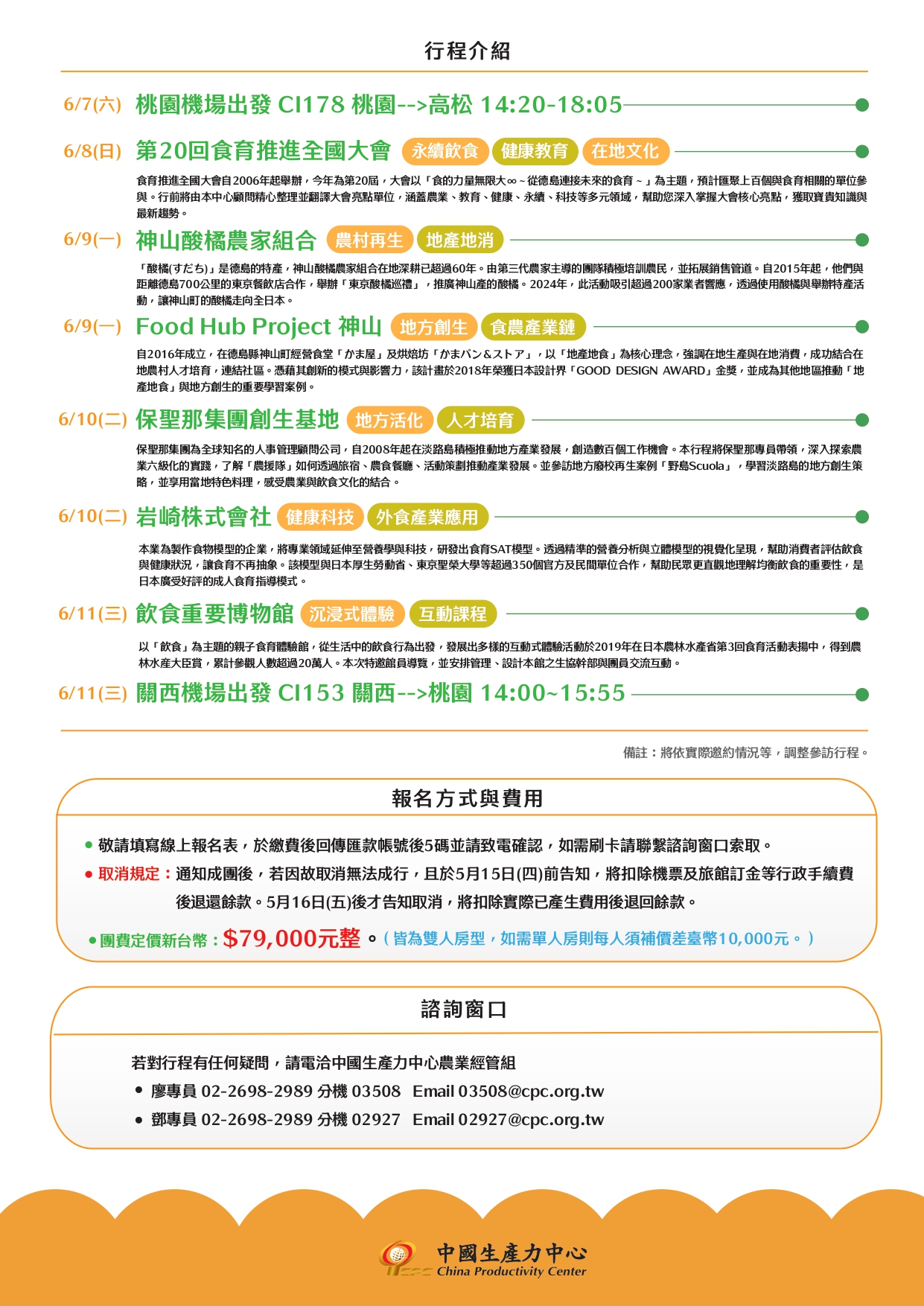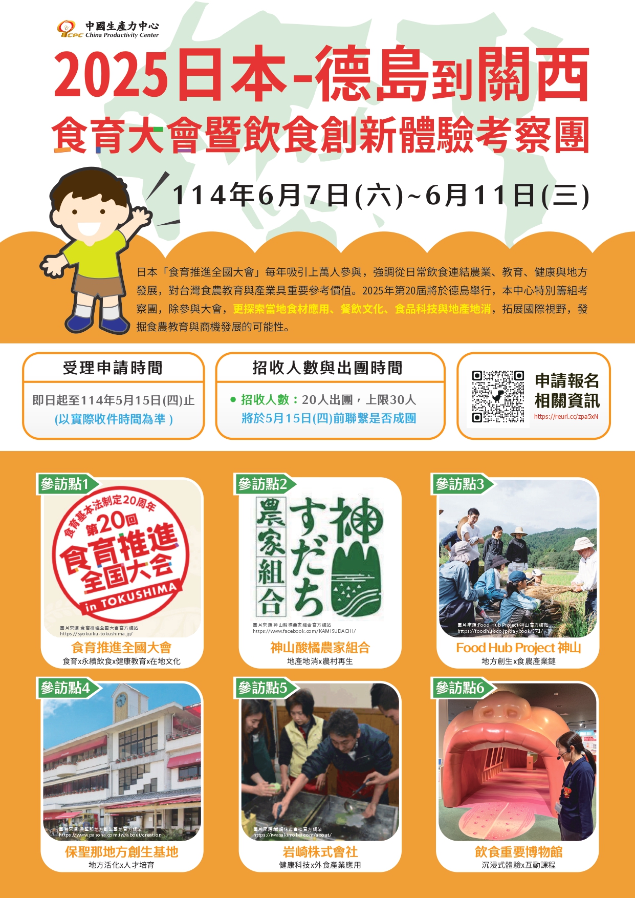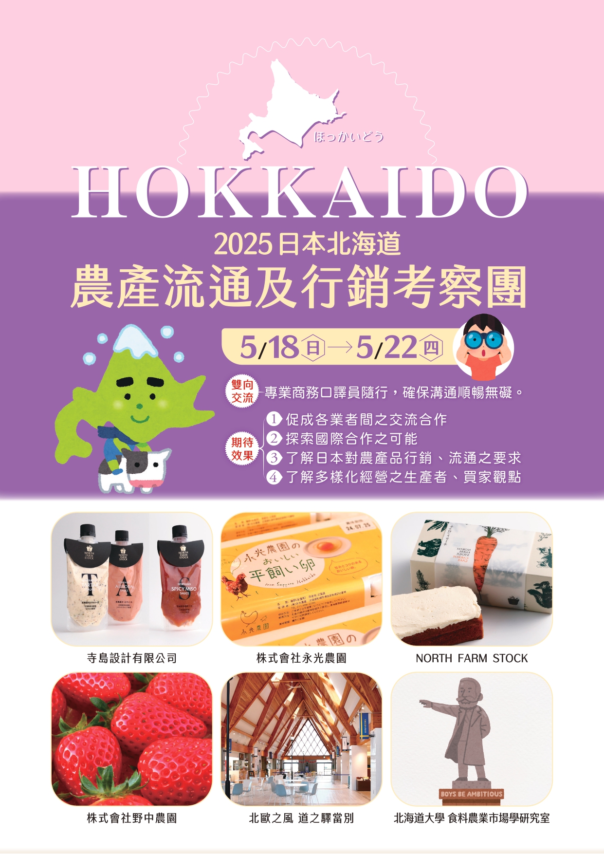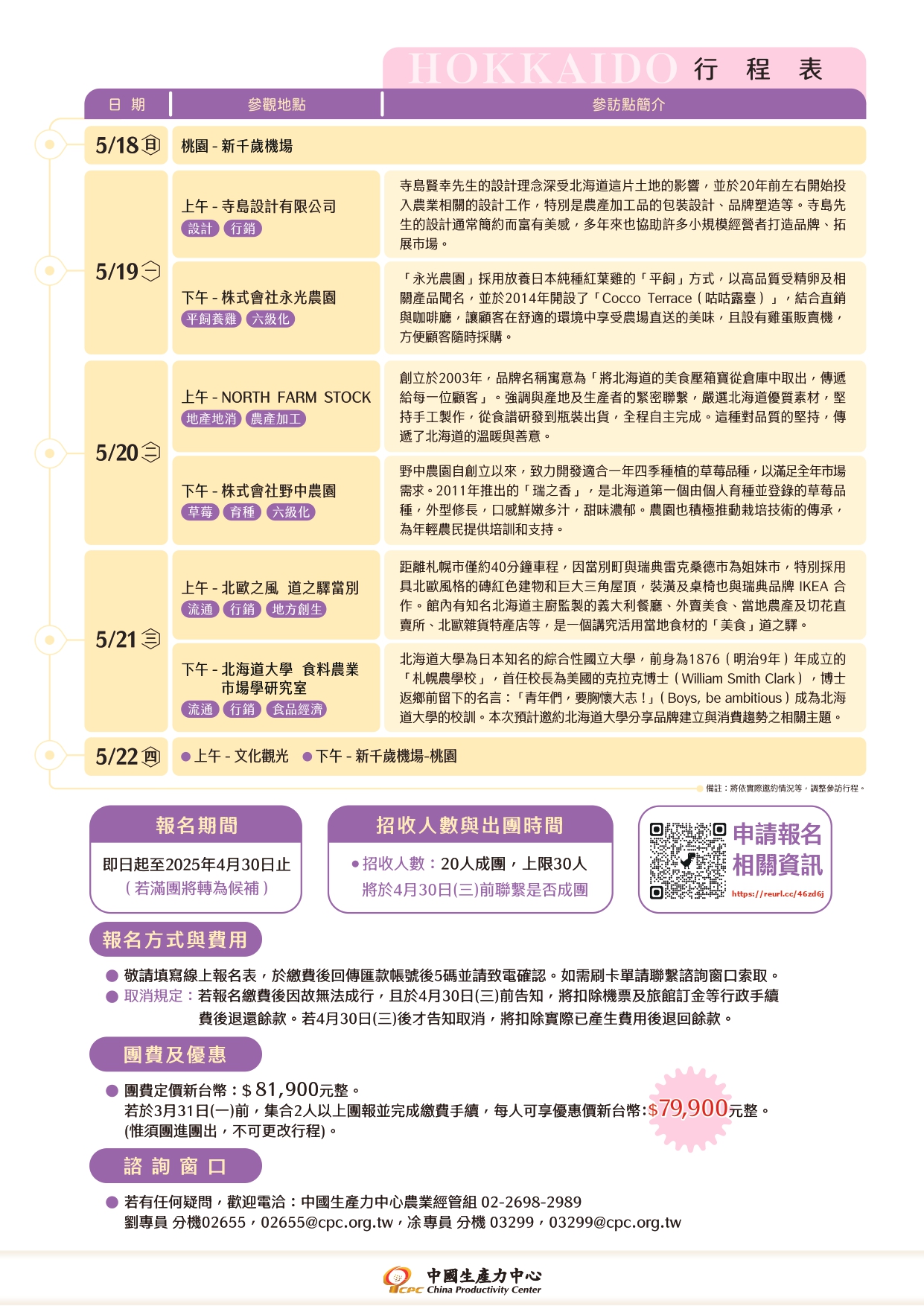財團法人中國生產力中心籌組「2025日本北海道農產流通及行銷考察團」及「2025日本食育大會暨飲食創新體驗考察團」,請踴躍報名參團